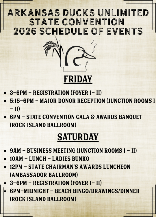 For more information about the convention, or to become a volunteer on an Arkansas DU chapter in your area, please contact Kenny at 501-944-4856.