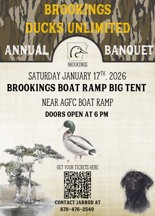Don't miss the annual Brookings DU banquet as we celebrate the season in the Big Tent! Not far from the AGFC boat ramp at Brookings, just look for the big circus tent and lots of people in camo! Lots of games, raffles, and a huge auction featuring the 2026 DU merchandise collection!  We'll have a great dinner & all the trimmin's, and plenty of refreshments - a great way to wrap up a day of duck hunting!