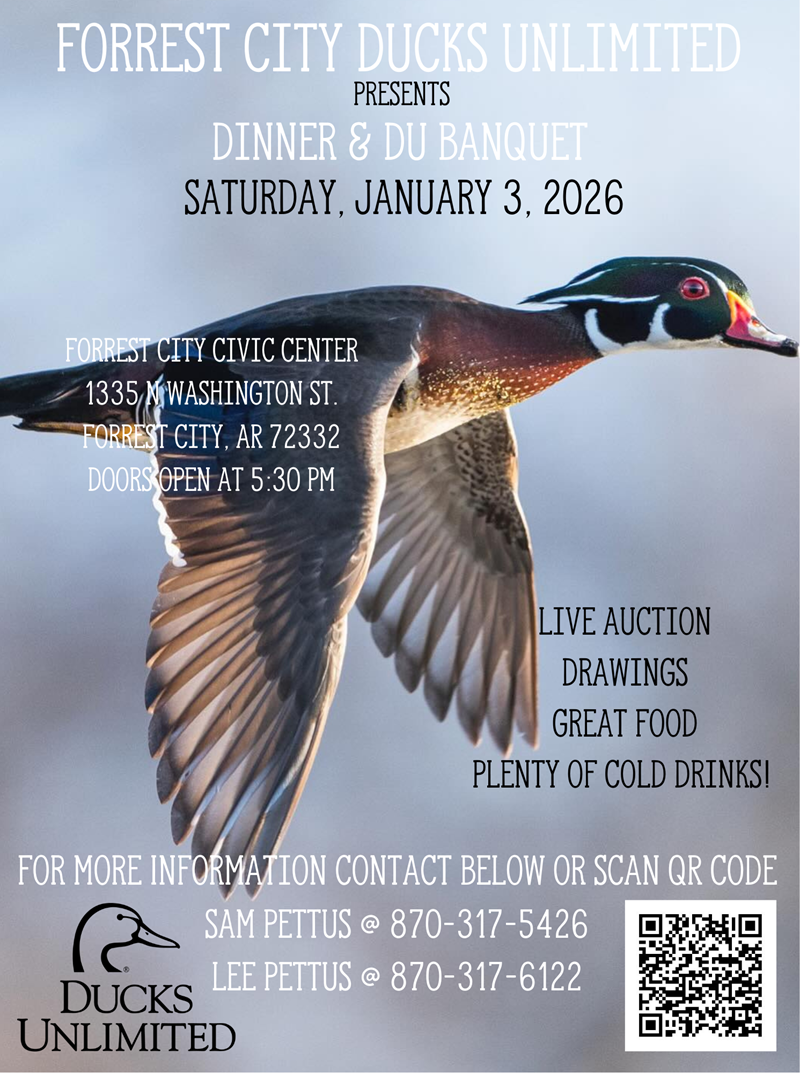 Join us as we celebrate the season at the Forrest City DU banquet on Saturday, January 3rd! Enjoy a great meal and fellowship at our banquet, featuring auction items, games, raffles, exclusive DU firearms and more, featuring the all-new 2026 DU merchandise collection!
