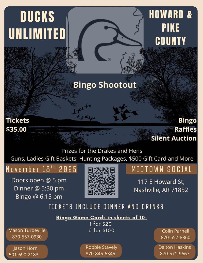 Come join us for our first ever Howard/Pike Co. Ducks Unlimited Bingo Night! Event will be hosted at Mid Town Social located at 117 E Howard St. Nashville, AR 71852. Doors will open at 5:00 pm, dinner will be served at 5:30 pm, and the bingo games will kick off at 6:15 pm. Several different ticket packages available, so make sure and get yours early before we sell out!