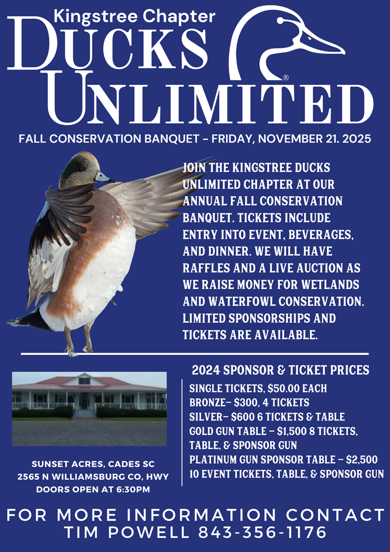 We are excited to be back! Make plans to join the Kingstree Ducks Unlimited Chapter for one of the best event in South Carolina. Tickets include dinner with all the fixings starting at 7:30pm. Followed by one of the country’s best auctions! Open bar serving beer, wine, and mixed drinks. This year’s auction features a number of different limited edition exclusive firearm as well as some of the country’s most sought after DU artwork, Trips, and merchandise. We’ll also have plenty of raffles for great merchandise and prizes
