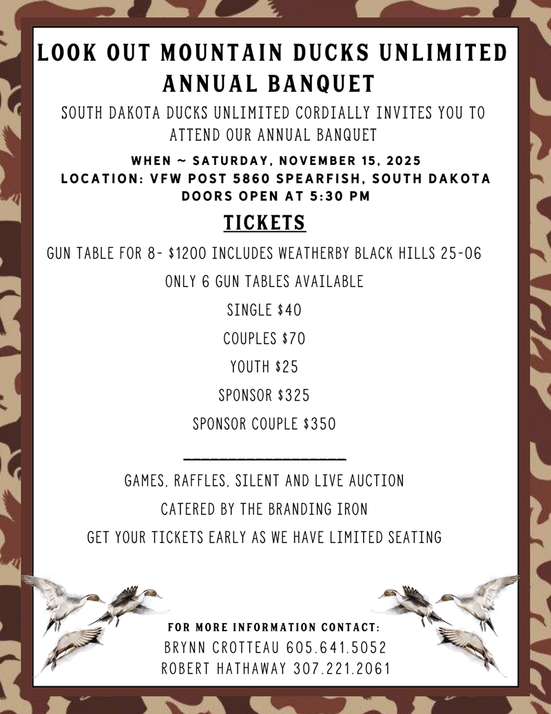 Lookout Mountain Ducks Unlimited is coming to Spearfish on November 15th! At the VFW Post 5860 Please join us for a fun and exciting banquet! We will have games, raffles, silent auction all capped with a great live auction!