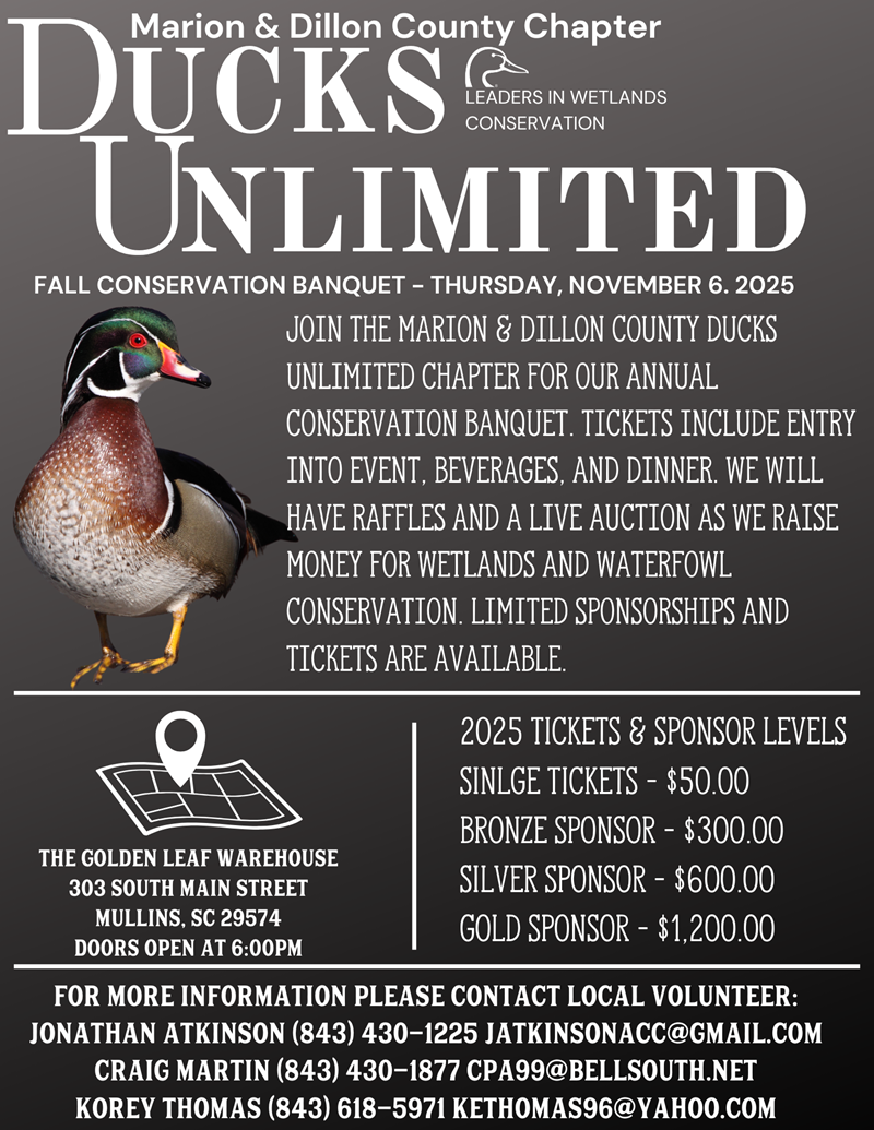 Make plans to join the Marion County Unlimited Chapter for one of the best event in South Carolina. Tickets include dinner with all the fixings starting at 7:30pm. Followed by one of the country’s best auctions! Open bar serving beer, wine, and mixed drinks. This year’s auction features a number of different limited edition exclusive firearm as well as some of the country’s most sought after DU artwork, Trips, and merchandise. We’ll also have plenty of raffles for great merchandise and prizes