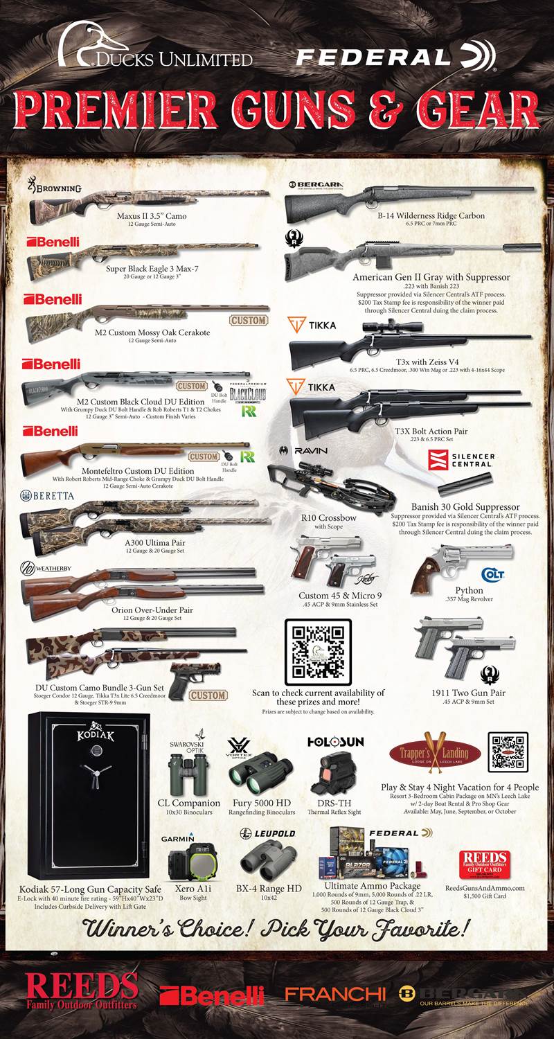 New this year we are offering a Swag Bag Raffle. Limited to the first 40 Swag Bags sold. Only $300 each and received a Bag of DU Swag, a $300 raffle pack, and a 1-in-40 chance to win choice from our Premier Gun Banner (below). Add a Swag Bag to your regular tickets for more chances to win!