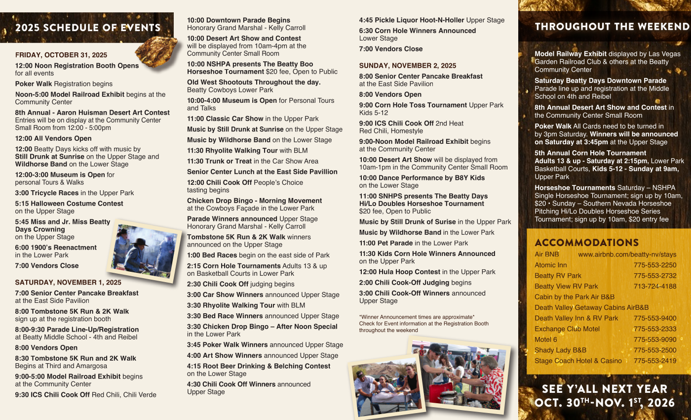 12:00 Beatty Days kicks off with music by Still Drunk at Sunrise on the Upper Stage and Wildhorse Band on the Lower Stage